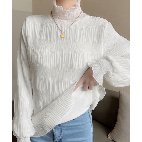 メロウフリルが首元と袖口を飾り、フェミニンな雰囲気を引き立てるハイネックブラウス。