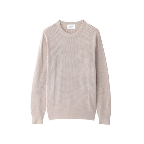 コーディネートしやすいプレーンなクルーネックデザイン。生地表面に格子状の凹凸の編み地が特徴のワッフル編みです。奥行きのある上品な表情とストレッチ性に優れ、保温性も高い編地です。