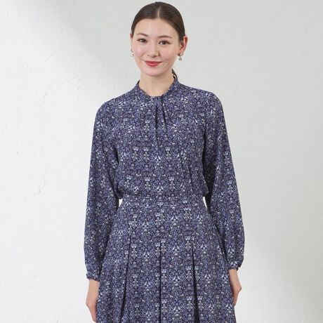 襟ぐりにボウタイ風のタックが入ったキレイ目ブラウス。