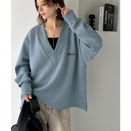 リブ切替を効かせた太めのVネックラインが小顔効果を与えつつ、大人っぽい雰囲気を演出。