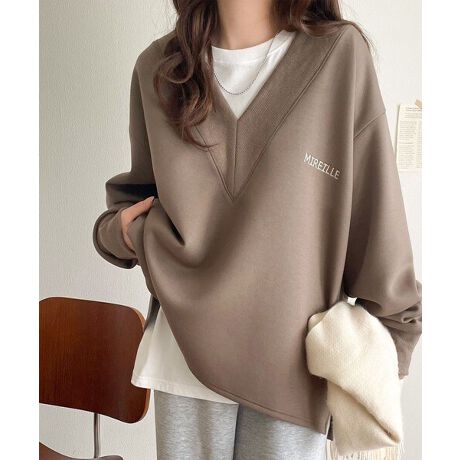 リブ切替を効かせた太めのVネックラインが小顔効果を与えつつ、大人っぽい雰囲気を演出。