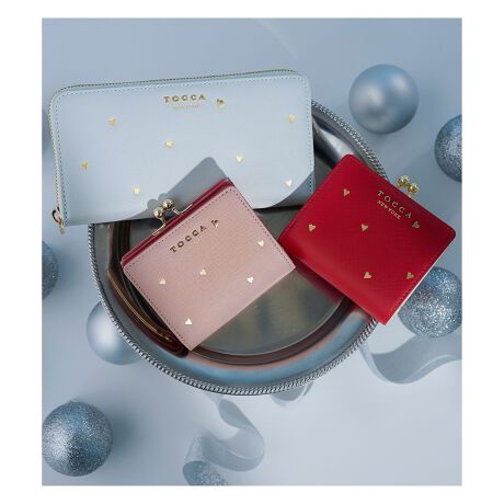 小さなハートたちを全体に散りばめたデザインが大人可愛い、二つ折りウォレット。箔押しのハート柄の中に1つだけメタルパーツが潜むリズミカルでリュクスなテクスチャーがおしゃれで、ロマンティックなムードとTOCCAならではのセンスが光ります。ベースには傷が目立ちにくく、落ち着いた風合いの型押しレザーを使用。内側にはニュアンスカラースムースレザーをチョイスし、開けたときのさりげない華やかさをプラスしています。