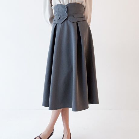 ジレ風のカットラインが効いたコルセットベルト付きのフレアースカート。