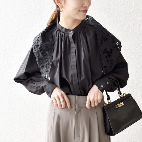 カットワーク刺繍のレーススカーフがセットになった、ボリュームスリーブのシャツブラウス。