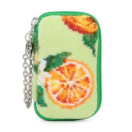 陽光を浴びてみずみずしく育ったビターオレンジを描いた『ネロリ』のキーポーチです。内側にポケットを充実させ、小物やカードをすっきりと収納できるのがポイント。チェーンストラップ付きで紛失防止に役立つほか、バッグに付けてワンポイントとしても便利なアイテムです。手付き巾着(NLI-260351)など、同柄のアイテムに付けて出かけるとより気分が上がります。