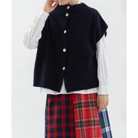 ふんわり軽やかで暖かい、カジュアルだけどどこか品のあるシェットランドセーター。ちょこんと立つハイネックのショート丈ニットベストです。前後どちらでも着用できる2way仕様。ブラウスやカットソーなどのトップス、ワンピースとのレイヤードなど幅広く活躍するアイテムです。