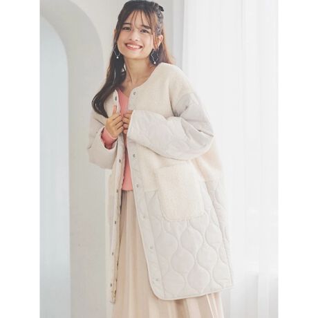 ボア調とキルティングの異素材切替が魅力のノーカラーコート。