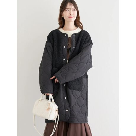 ボア調とキルティングの異素材切替が魅力のノーカラーコート。