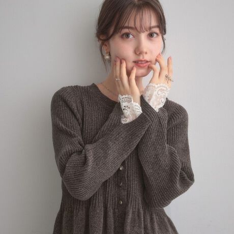 ニットの素材感と袖口のレースデザインが可愛く、冬のお出かけにぴったりの一枚です〇