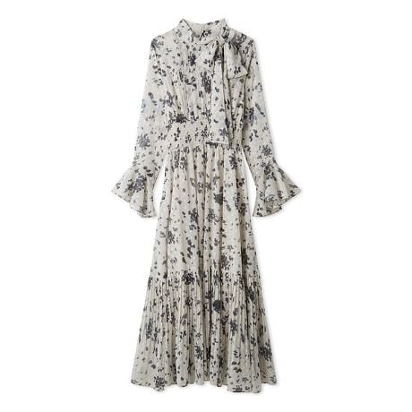 <b>【ラメとプリントが織りなす上品な華やぎが絵になるボウタイワンピース】</b>