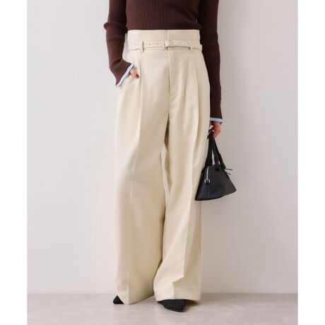 すっきり美シルエットでストーンと下に落ちるように作っています。ややハイウエストでトップスをウエストインした時も決まりやすく、ジャケットシーンのあわせとしても大活躍。裾はそこまで広くないワイドシルエットなので、着用シーンも幅広いです。共地のベルト付きできちんと感も◎。ウエスト部分は後ろのサイドにゴムを入れ、スッキリ感と着心地を両立させています。