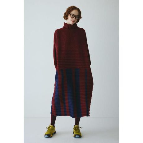 オリジナル柄がを引くニットワンピース>温かみのあるふっくらした糸を多本使いし、リブ編のゲージサイズと方向を調整することで、独特なボックスシルエットのワンピースに仕上げました。リブ編の糸の色をバランスよく調整することで生まれるオリジナル柄が視覚的にも楽しい印象を与えてくれます。オーバーサイズシルエットで、体型をを拾わないアイテム。1枚でスタイリングが完結します。ボックスニットワンピース[注意事項] ※画像の商品はサンプルです。実際の商品と仕様、加工が若干異なる場合があります。 ※画像の商品は光の照射や角度、お使いのモニター環境により、実物と色味が異なる場合がございます。 ※着用、お取り扱いの際は、アテンションタグをご確認ください。