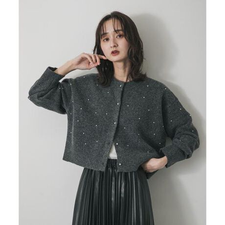 暖かなニット素材に、ドット柄のようにボールスタッズを散りばめたデザインカーディガン。クロップド丈なので、ハイウエストのパンツやスカートと合わせるだけで、スタイルアップと今年らしいバランスが叶います。ボタンを閉めてプルオーバーとして着るのもおすすめ。シンプルながらも華やかさをプラスしてくれるアイテムです。