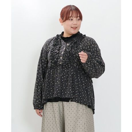 レトロムード漂う2種類の小花柄をミックスし、メロウ始末のフリルをプラス。