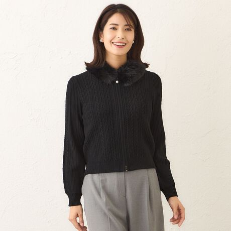 ケーブル編みのスリムジップ仕様クルーネックカーディガン。ファーティペットは取り外し可能で、スタイリングに合わせて印象を変えられます。