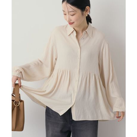 光沢を抑えた上質感あるサテン生地で仕立てたデザインブラウス。ウエストマークに切り替えギャザーを施したほんのり広がるティアードフレアが特徴的な1枚です。コンパクトな襟に同色ボタンをあわせたシンプルなワントーンがすっきり見えを演出。腰回りをカバーする絶妙な丈感も嬉しいポイントです。きれいめはもちろん、カジュアルなデニムに合わせるのもおすすめ。透け感[ややあり]