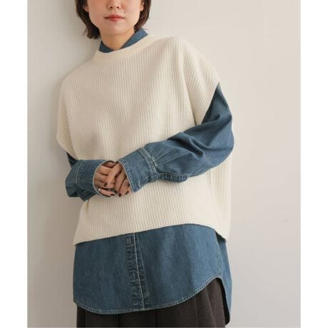持っているハミルトンウールのセーターが軽く暖かいので、ハミルトンウールのベストを探していました。身幅は広めですが、フレンチスリーブのように肩に沿ってフィットするため、ダボっとした感じにはなりません。