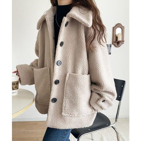 厚手の大粒ボアを使用した、大きめポケットつきショートブルゾン。
