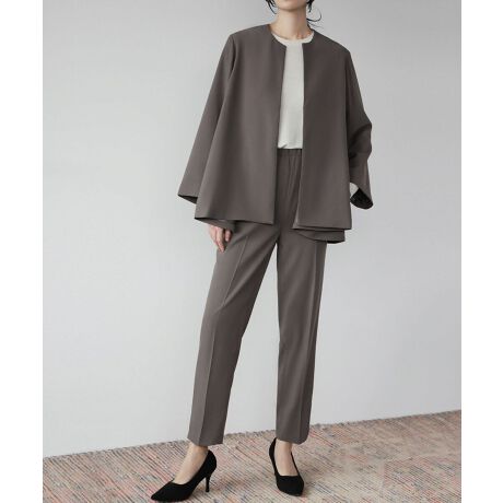 パンツは裾に向かって細くなるテーパードシルエットで、脚長効果・美脚効果が期待できる一枚です。