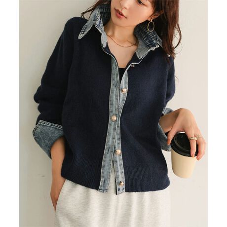 デニム素材が目を惹く、異素材ドッキングニットカーディガン。