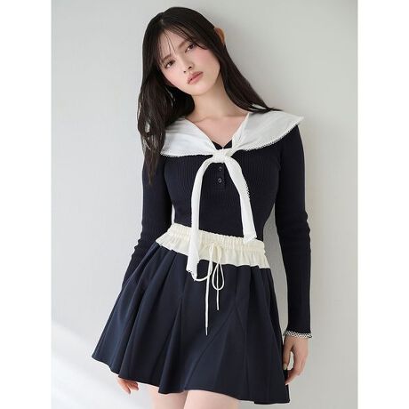 ホワイト、ブラック、ネイビーの3色展開です。ホワイトとブラックはコットン見えのポリエステル生地とタフタ生地を使用。ネイビーはTR生地を使用。ウエスト周りはホワイトのバイカラーで仕上げました。