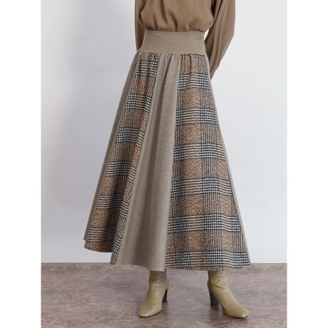 温かみのある無地とチェック柄を切り替えたフレアスカート。