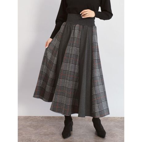 温かみのある無地とチェック柄を切り替えたフレアスカート。