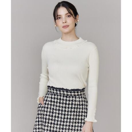 ■デザイン1枚ではもちろん、これからの季節はインナーとしても活躍するリブプルオーバー。衿と袖口にあしらった華奢なチビフリルと、袖口のパールがMaglieらしいアクセントを添えます。身体に張り付きすぎない程よいゆとりのあるシルエットで、暖かいインナーも重ねやすい仕様に。チクチクしない柔らかな編み地で、春先まで快適に着用いただける万能アイテムです。■素材シルクの様な光沢があり見た目や肌触りが良くテロンとした落ち感のある素材のレーヨンと、しわになりにくく強度のあるポリエステルと混紡した素材です。吸水速乾性に優れきれいな編み目で清涼感があり、ストレッチ性のある素材感なので長い期間着用していただける素材です。・水洗い可■サンプル撮影商品画像の商品はサンプルです。実際の商品とはサイズや色味、素材、デザイン等の仕様が若干変更になる場合がございます。■カラーについては、可能な限り実際の商品に近いカラーにて撮影をおこなっておりますが、照明の関係により実際の製品とは色味が違って見える場合があります。またパソコン・スマートフォンなどの環境により、若干製品と画像のカラーが異なる場合もございます。現物と画像のカラー差異については返品理由となりませんので、予めご了承ください。