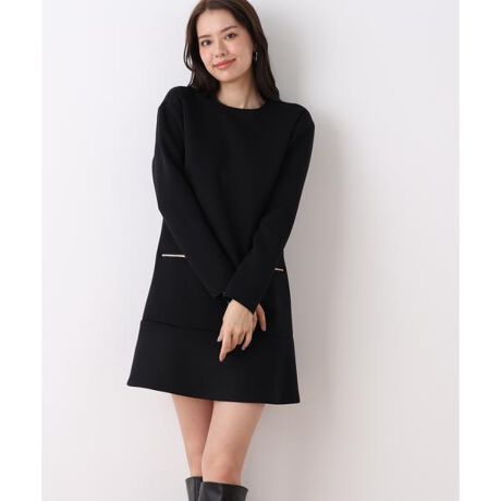 ダンボールニット素材を使用したミニワンピース。程よいハリ感とソフトなタッチで、着心地の良さも魅力です。肩まわりは少しドロップしたゆったりシルエットで、身頃もややゆったりめに仕上げ、裾の切り替えからフレアを出すことで女性らしいラインを演出します。サイドのジップデザインがスタイルをシャープに引き締める、おしゃれでフェミニンな一着です。
