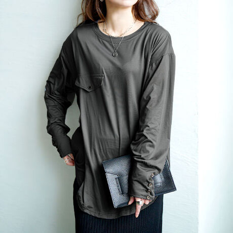 トレンドのロングカフスが印象的なカットソーチュニックです。程よいゆるさがあるストレートシルエットと長めの着丈がスリム見せ。袖口には5つ並んだ飾りボタンをあしらい、手元に華やかさとモード感をプラス。太もも真ん中までの丈感でヒップや腰まわりを自然にカバー。すとんと落ちるラインが縦の印象を引き立ててすっきり見えを実現します。素材は伸縮性のあるポリエステル100%のカットソー生地。カラーはベーシックから、ニュアンス感のあるものまでの展開。シンプルながらディテールで差がつくデザインだから、デニムやレギンスとの相性も抜群。おうち時間からワンマイルコーデ、ちょっとしたお出かけまで幅広く活躍します。