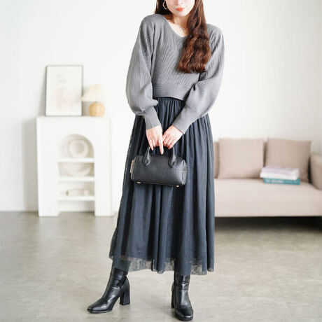 大人可愛い大本命☆リブニットドッキングチュールワンピースクロップドリブニットとチュールスカートの異素材ドッキングデザインで一枚で手抜きに見えないコーデ見え◎ハイウエスト切り替えで自然にくびれをメイクし女性らしい脚長シルエットに!切り替えから裾にかけてふわりと広がるフレアシルエットで、気になるぽっこりお腹・脚のライン・ヒップを大人可愛くカバーしてくれます♪