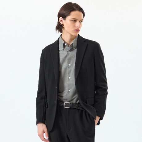 シングル2ボタンモデルの腰フラップポケットデザイン。細見返し仕様で裏地なしの軽量なアンコンジャケットです。ニットのような見た目のカジュアル感がポイントです。