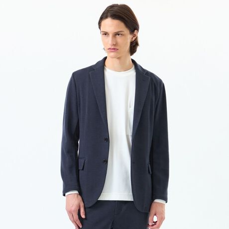シングル2ボタンモデルの腰フラップポケットデザイン。細見返し仕様で裏地なしの軽量なアンコンジャケットです。ニットのような見た目のカジュアル感がポイントです。
