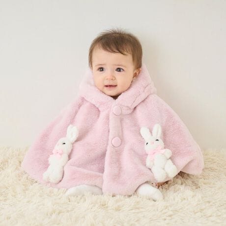 表面にのせたうさぎのぬいぐるみが可愛いフェイクファーケープです。ぬいぐるみの手足は動かせる仕様で、お好みのポージングにして楽しめます。サイズフリーにしており、2歳半くらいまで長く着用できるのもうれしいポイントです。裏地にはプチローズ総柄で上品に仕上げました。