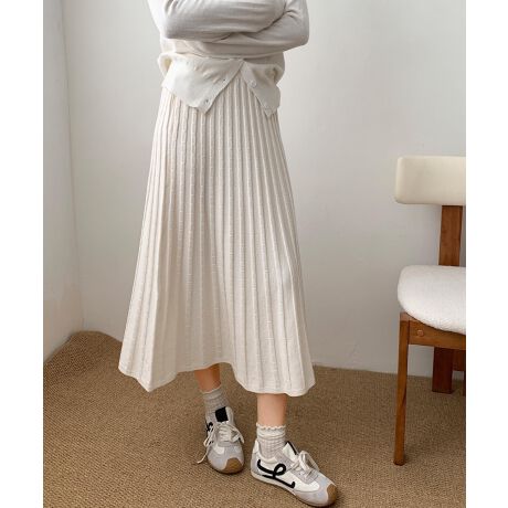 柔らかなニット素材を使用した、女性らしい雰囲気漂うプリーツロングスカート。