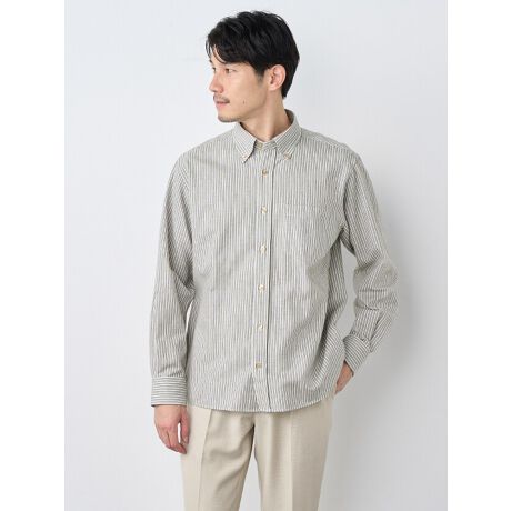 [型番:7250281][型番:7250281]「コットン」 「アクリル」 「ウール」 3種類の原料をブレンドした生地に椿油を配合した、やわらかくあたたかな風合いが特徴の生地を使用したボタンダウンカラー長袖シャツ。トラッドな色使いのストライプ柄で、オトナな雰囲気のスタイリングに仕上がる1着に。