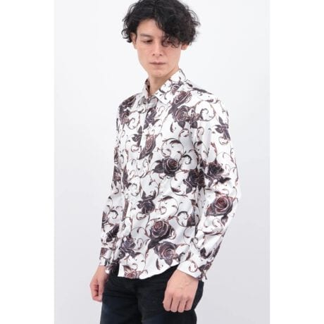 バロック調の優雅なオーナメントと、フィリグリー(金や銀を糸のように細くして巻き上げ、模様をつくる金細工技法)を刻んだリアルなバラを融合させたオリジナルプリントシャツ。