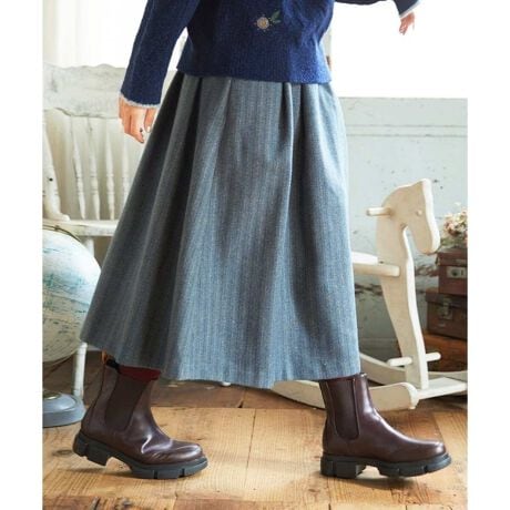 秋冬のお出かけにぴったりなスカート。女性らしい自然なAラインシルエットです。前後のウエストにタックを施し、お腹周りはすっきり、裾にかけてきれいなフレアが出るのが特徴。サイドファスナーで着脱可能です。便利なポケット付き。