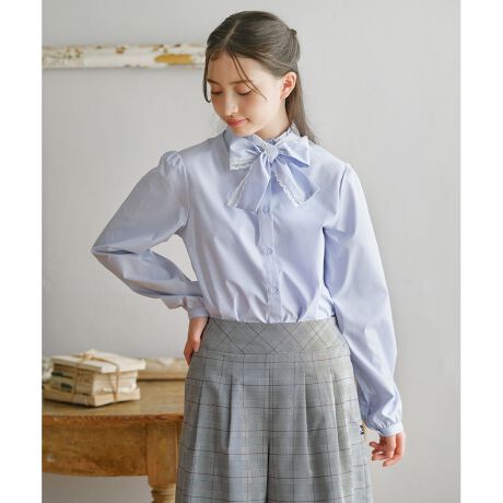 ■デザインボウタイ部分に繊細なレースをあしらった大きなリボンタイがアクセントとなり、上品で華やかな印象のブラウスです。