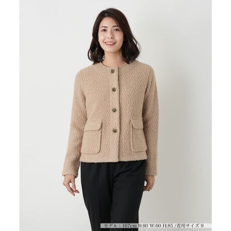 表面のループ感が愛らしいブークレー素材を使用した、ノーカラージャケット。 すっきりとした首元が上品な印象を与えます。フロントはクラシカルなモチーフボタンの裏がスナップ仕様になっており、着脱もスムーズに行えます。フラップ付きのポケットがデザインのアクセントに。 伸縮性に優れたやや厚手の生地で、室内やちょっとした外出時のライトアウターとしてカーディガン感覚で気軽に羽織れます。