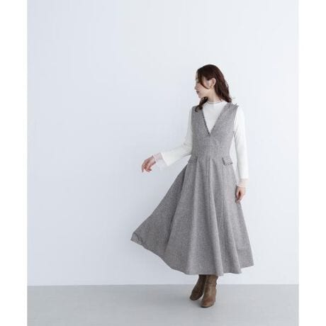 フィット&フレアシルエットのジャンパースカート。襟ぐりとフラップ縁に入れたフリンジディテールがポイントです。フラップは飾りにして、脇にスラッシュポケットを付けた便利な仕様になっています。秋冬ムードを感じるホームスパン調のツイード素材に、きらっと光るラメ糸が華やかな印象を叶えてくれます。<素材>ラメ糸が入っているホームスパン調のツイード素材を使用しています。<詳細>仕様・後ろファスナー裏地・あり透け感・なし / 光沢・あり / 伸縮性・なし生地の厚さ・普通※モデルの着用画像の場合、光の当たり具合により、実際の色味と異なって見えることがございます。色味は、商品単体の画像をご参照ください。