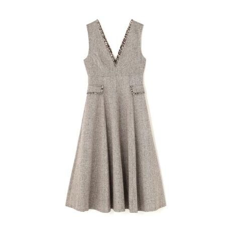 フィット&フレアシルエットのジャンパースカート。襟ぐりとフラップ縁に入れたフリンジディテールがポイントです。フラップは飾りにして、脇にスラッシュポケットを付けた便利な仕様になっています。秋冬ムードを感じるホームスパン調のツイード素材に、きらっと光るラメ糸が華やかな印象を叶えてくれます。<素材>ラメ糸が入っているホームスパン調のツイード素材を使用しています。<詳細>仕様・後ろファスナー裏地・あり透け感・なし / 光沢・あり / 伸縮性・なし生地の厚さ・普通※モデルの着用画像の場合、光の当たり具合により、実際の色味と異なって見えることがございます。色味は、商品単体の画像をご参照ください。