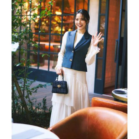 テーラー型のコンパクトジレとティアードスカートの異素材セットアップ。スカートはジレと同じ生地を一部使用しているため、SETUPでも単品使いでも存在感のあるデザインです。ジレはきらっと光るボタンがアクセント。ジレのインナーはコンパクトニット合わせがお勧めです。