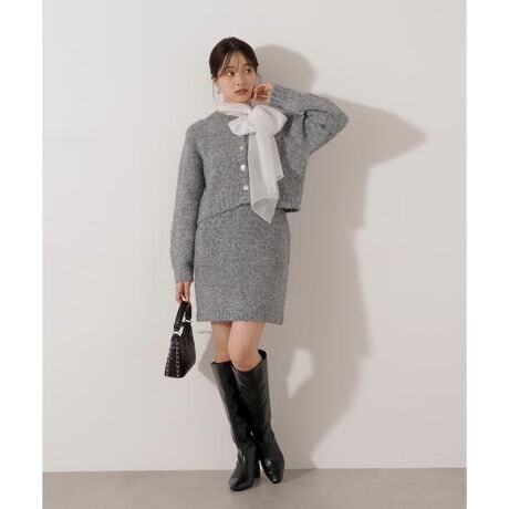 ミックス調のウォーム感とキラキラの糸を組み合わせた大人かわいいニットSETUP。カーディガンは取り外しできるボウタイリボン付き。ボウタイリボンを取ると、シンプルなカーディガンとしても使えるのでコーディネートの幅が広がります。ボウタイリボンは左に寄せてつけるとアクセントになっておすすめ。ミニスカートはすっきりシルエットで脚長効果を期待。寒い季節に映える2点セットです。