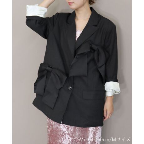 光沢感のあるサテン生地のリボンと、ジャケット本体のマットな質感とのコントラストが洗練されたアクセントに。