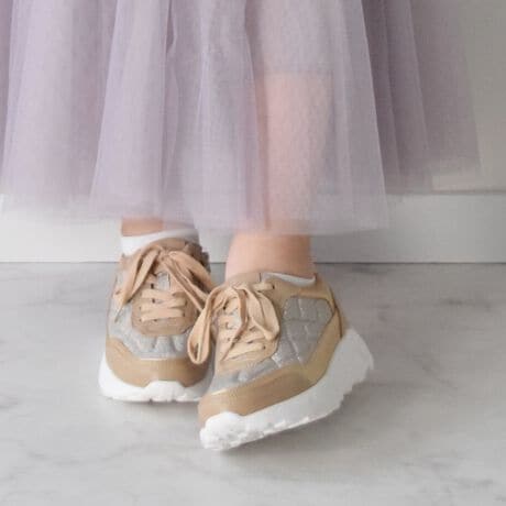 グリッター素材にキルティングを施した、ちょっとしたキラキラさがアクセントのヒールアップスニーカー。