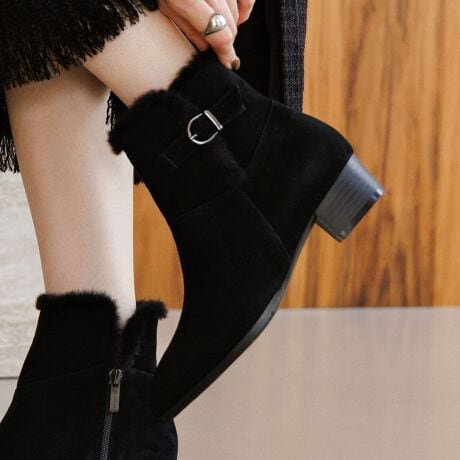 毎年大人気のファーブーツが今年も登場!履き口から覗くフェイクファーがあたたかく、冬の足元の定番アイテムです。程よい高さで安定感のある3.5cmヒールと、足首がすっきり見える女性らしいシルエットが人気の秘密。