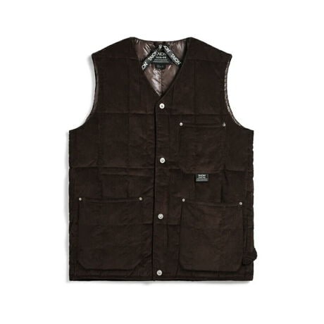 コーデュロイ素材を使用した、暖かみと耐久性を備えたVネックダウンベスト。