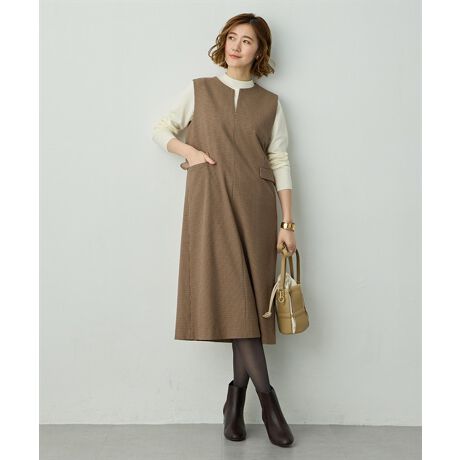 [型番:525233]トラッドに着こなす大人のためのキーネックジャンスカ毎年人気のキーネックジャンスカが今年も登場。トラッドなチェック柄とシンプルな無地の2タイプ展開で、シーンに合わせた着こなしを楽しめます。程よく開いたキーネックが顔まわりをすっきり見せ、インナー次第でロングシーズン活躍。上品な素材で、きれいめにもカジュアルにも映える一枚です。