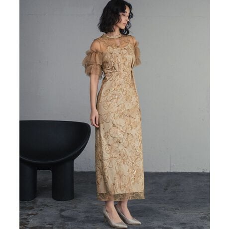 繊細なチュールの上にトレンドのスパンコールをふんだんに使った刺繍を施したオケージョンドレス。